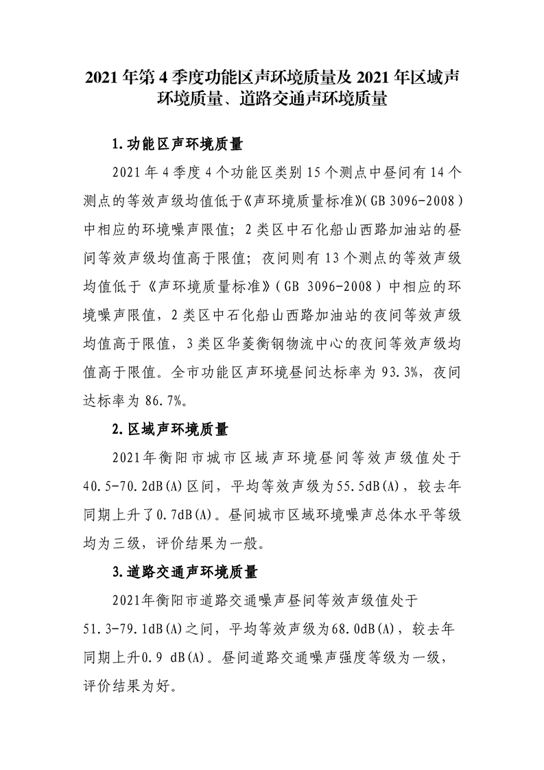 2021年第4季度功能区声环境质量及2021年区域声环境质量、道路交通声环境质量