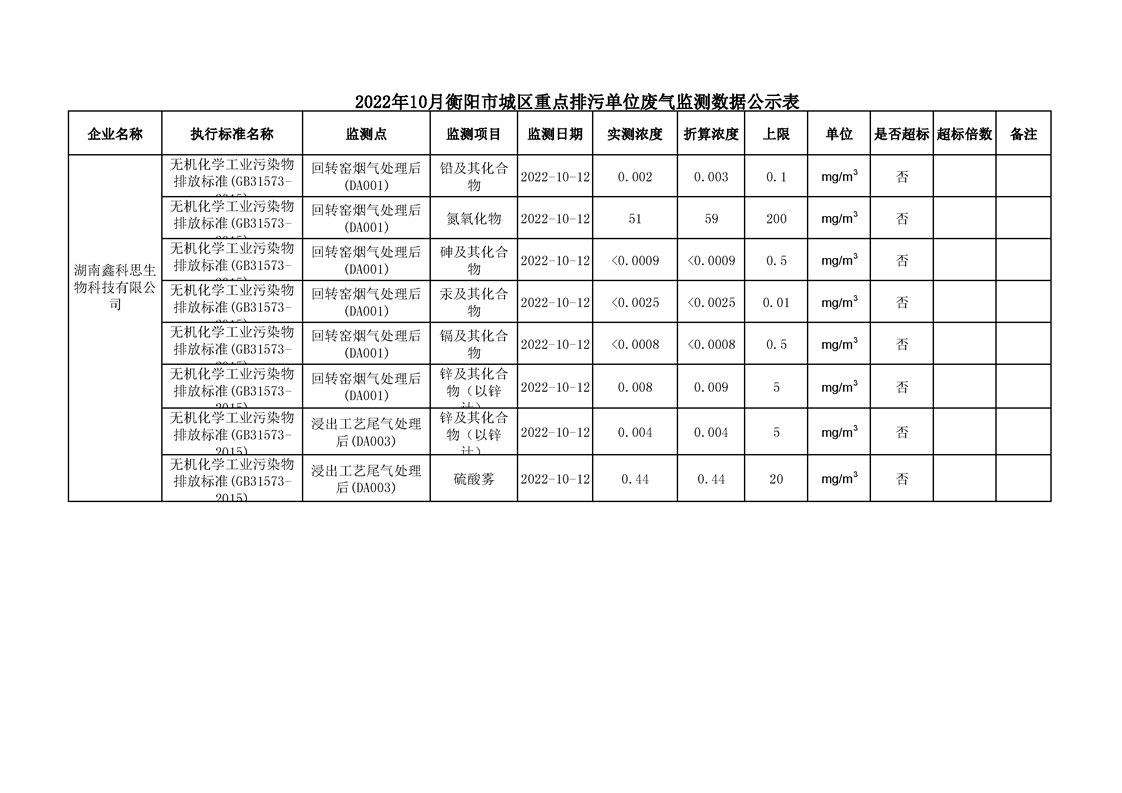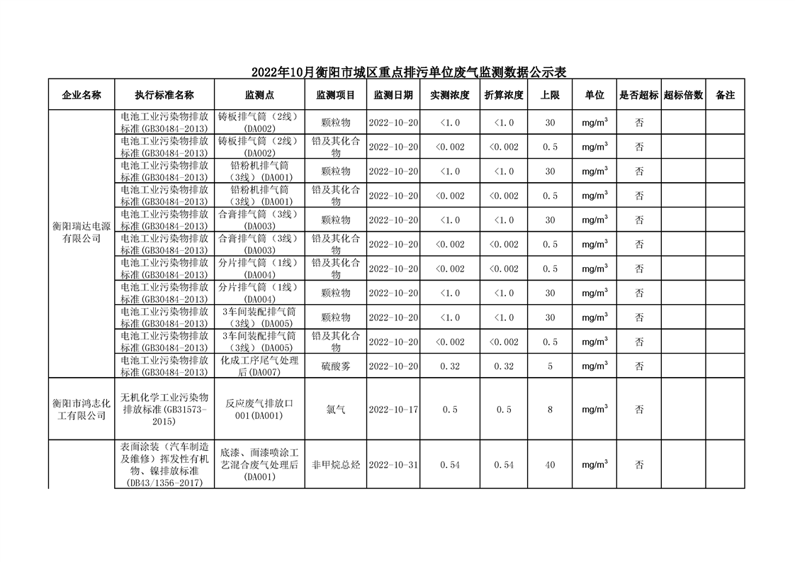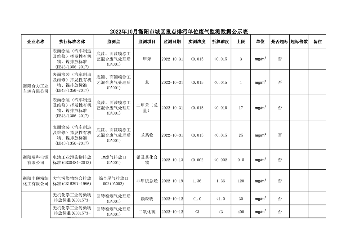 2022年10月市城区重点排污单位废气执法监测数据公示表