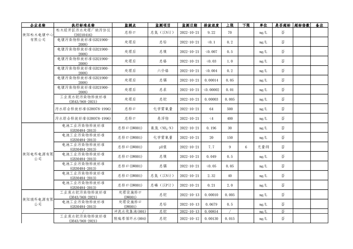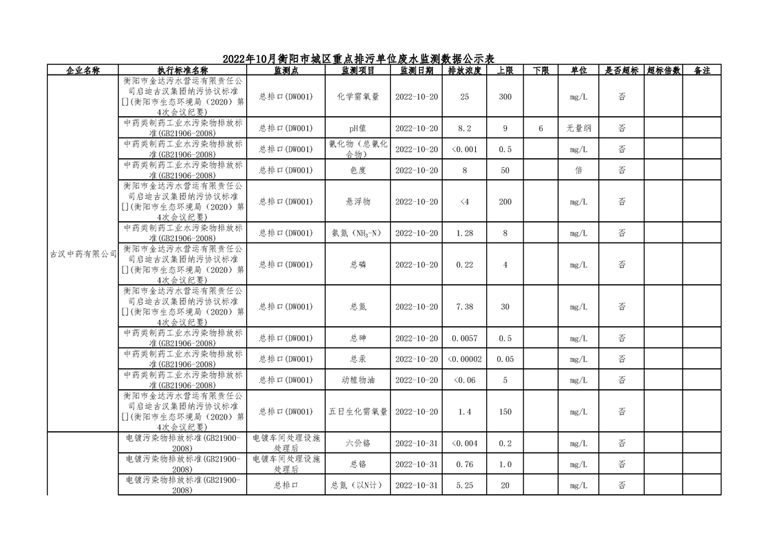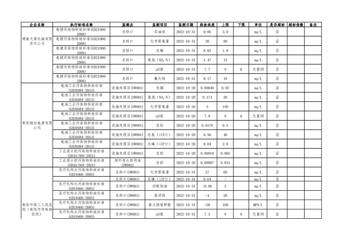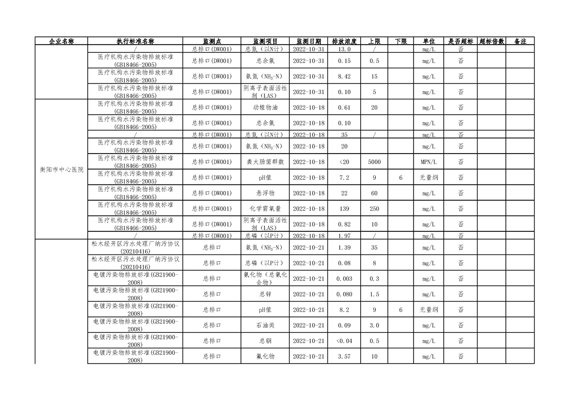 2022年10月衡阳市城区重点排污单位废水执法监测数据公示表