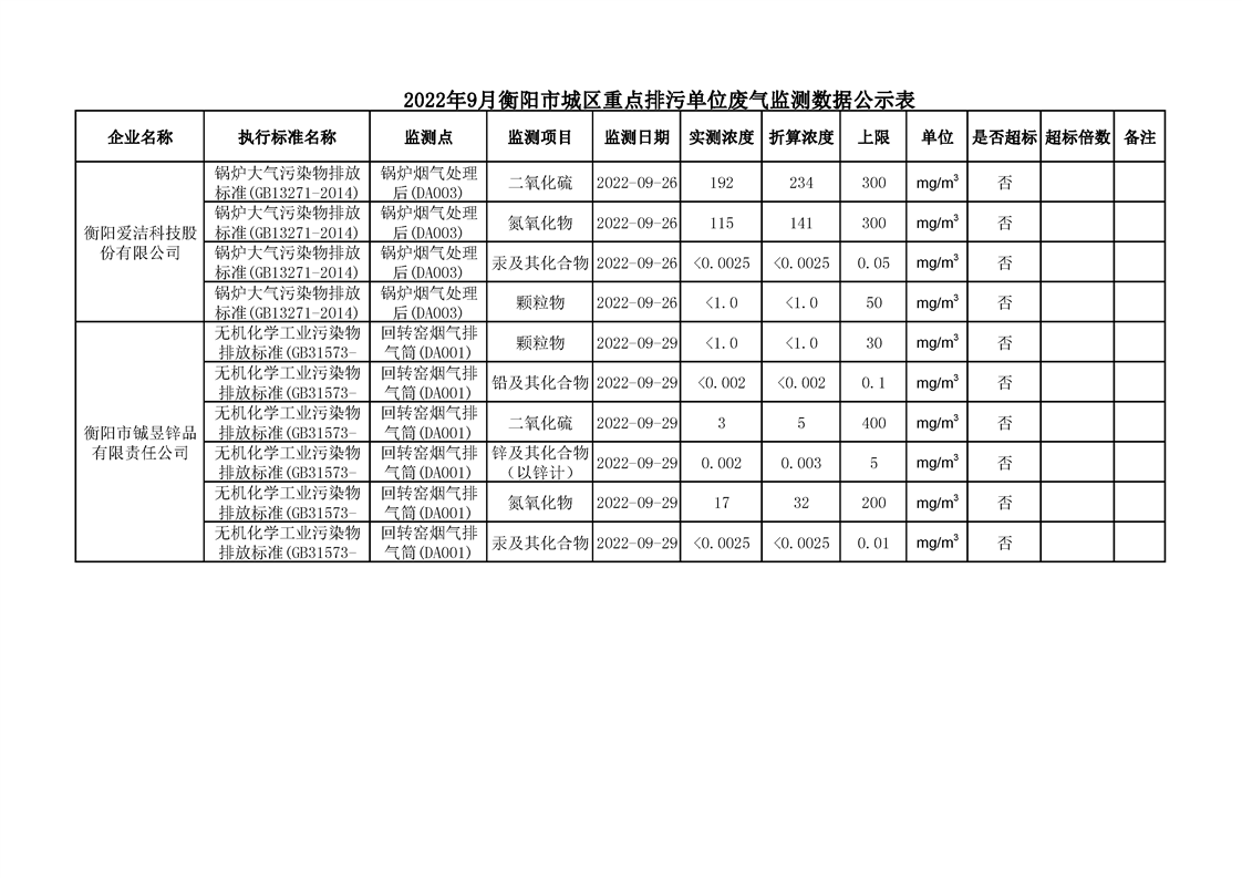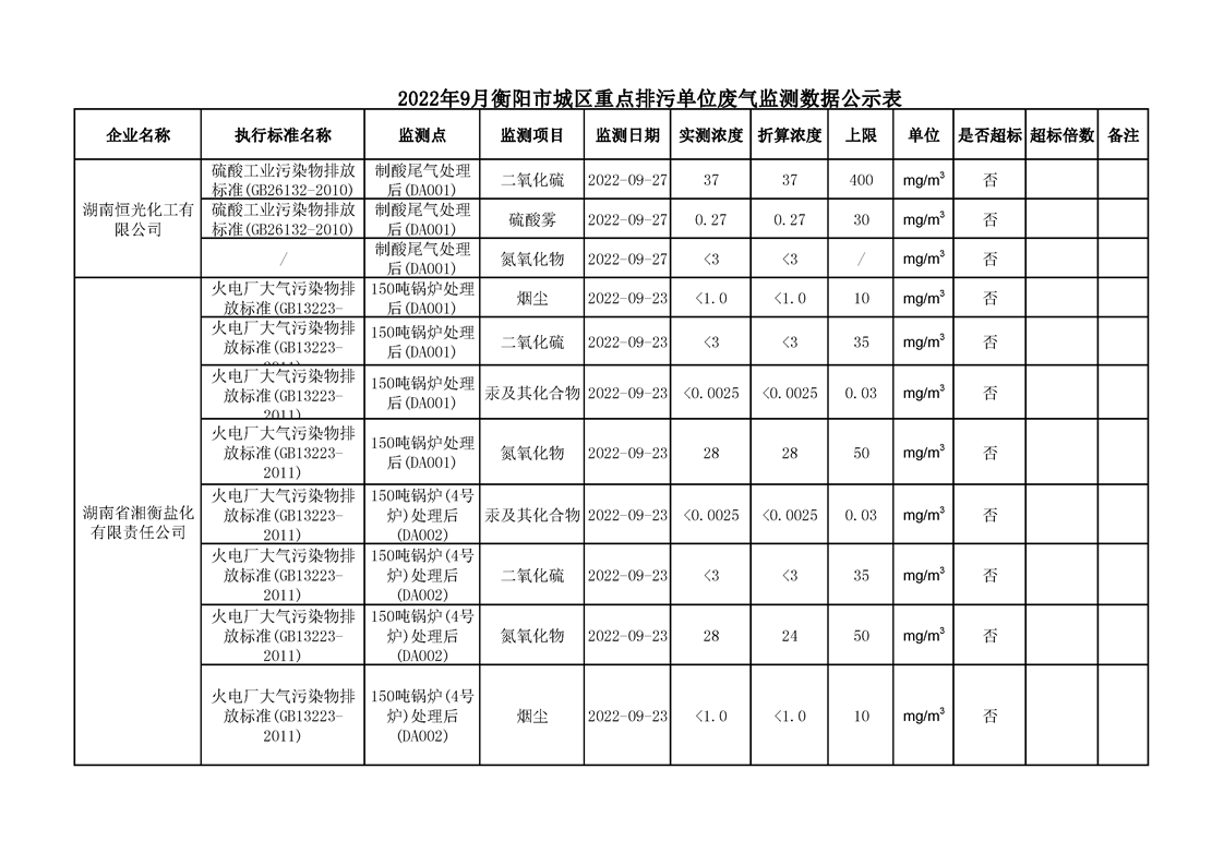 2022年9月市城区重点排污单位废气执法监测数据公示表