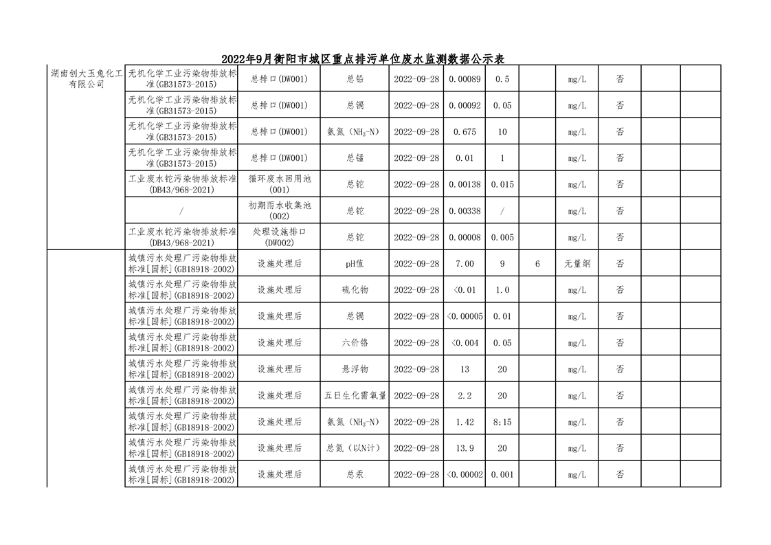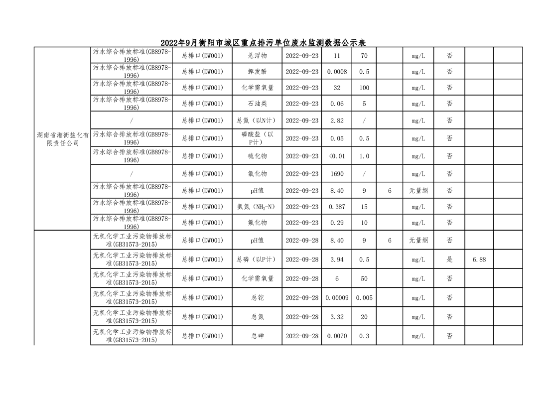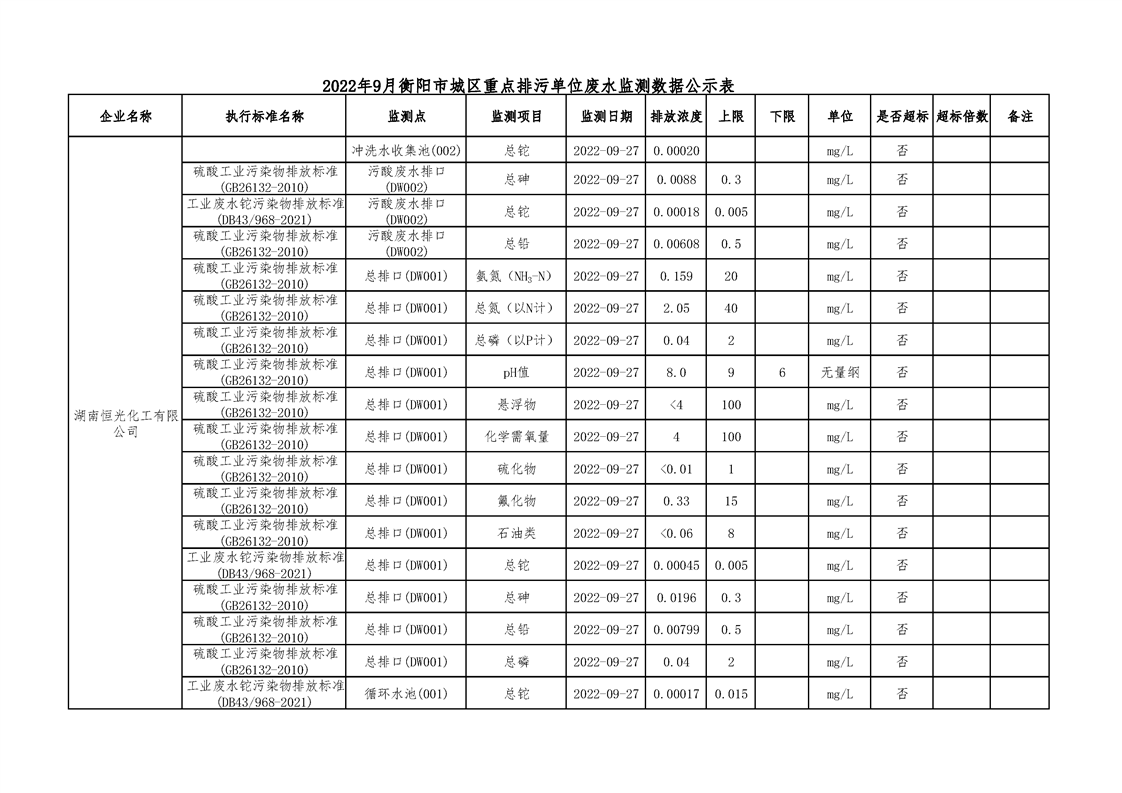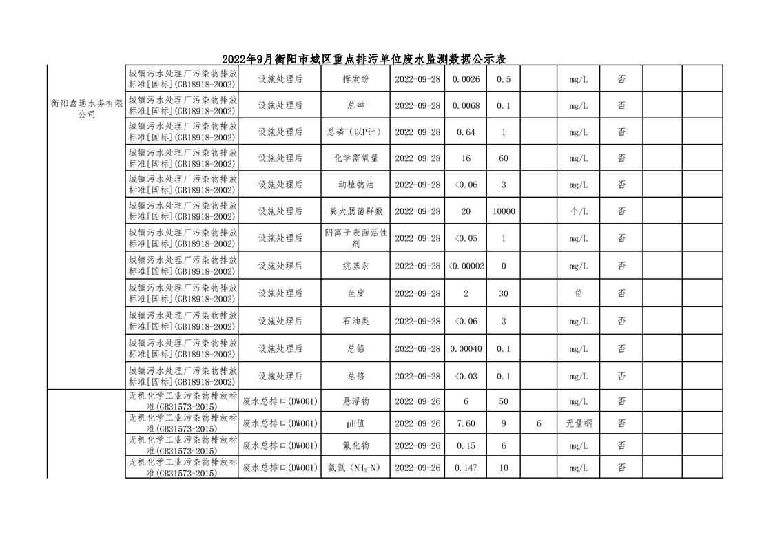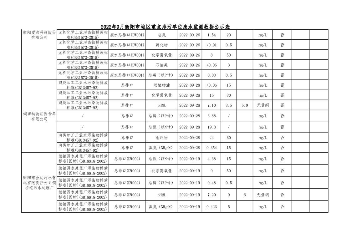 2022年9月衡阳市城区重点排污单位废水执法监测数据公示表