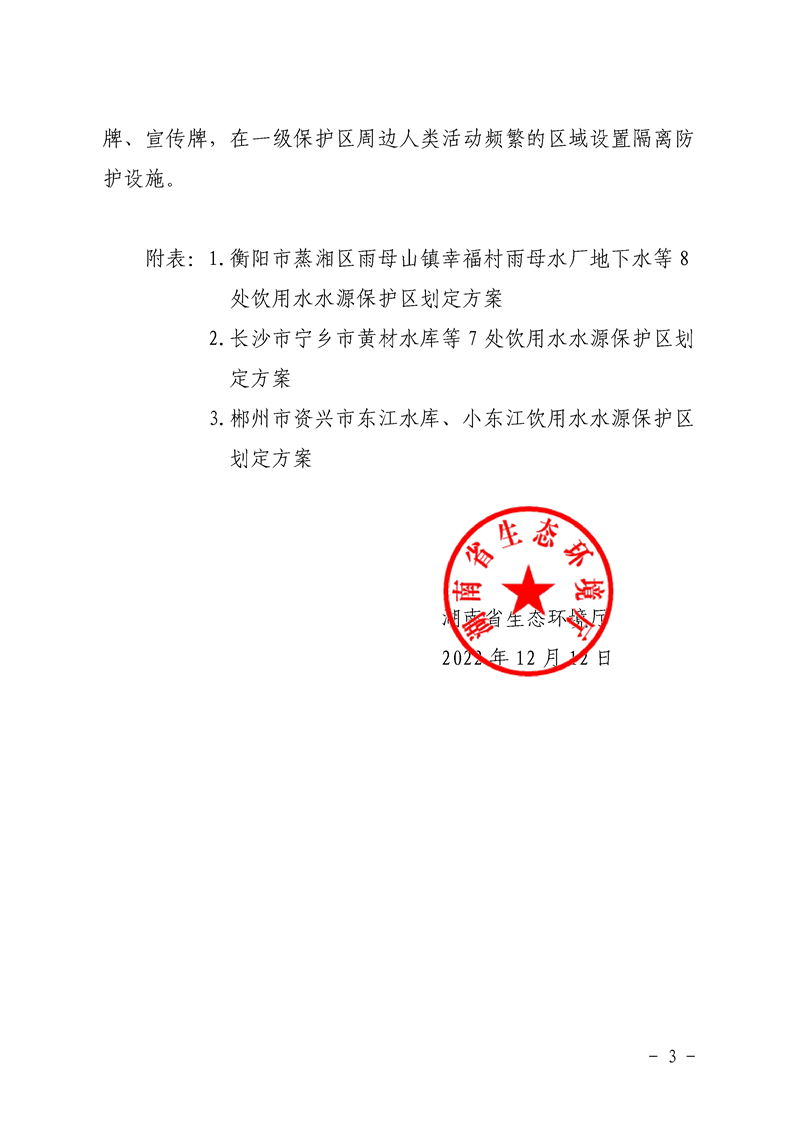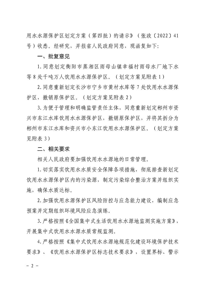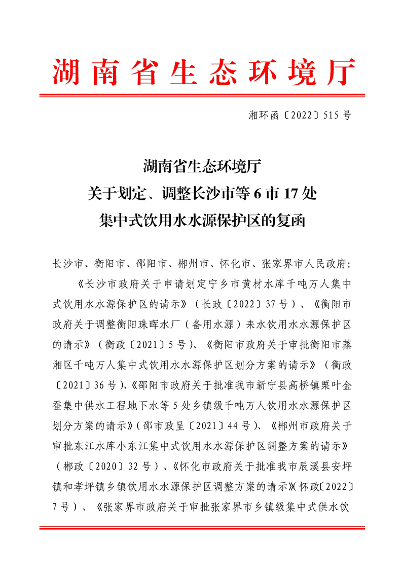 关于划定、调整长沙市等6市17处集中式饮用水水源保护区的复函(湘环函〔2022〕515号)
