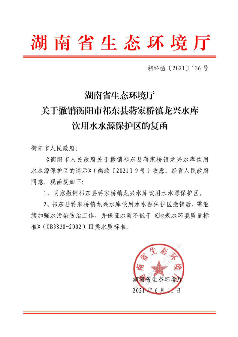 关于撤销衡阳市祁东县蒋家桥镇龙兴水库饮用水水源保护区的复函