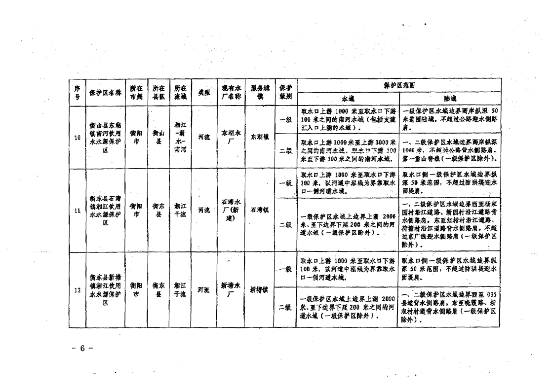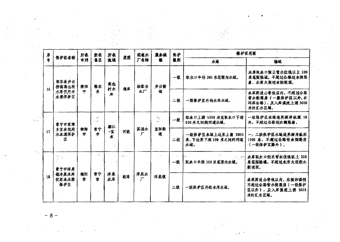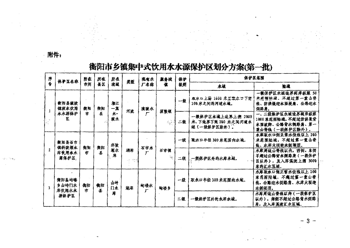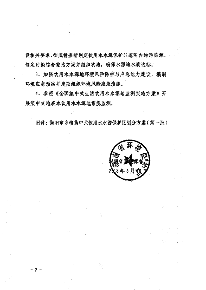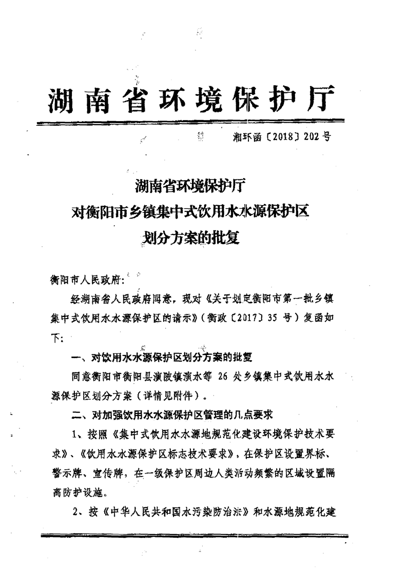 湖南省环保厅对衡阳市乡镇集中式饮用水水源保护区划分方案的批复(湘环函【2018】202号)