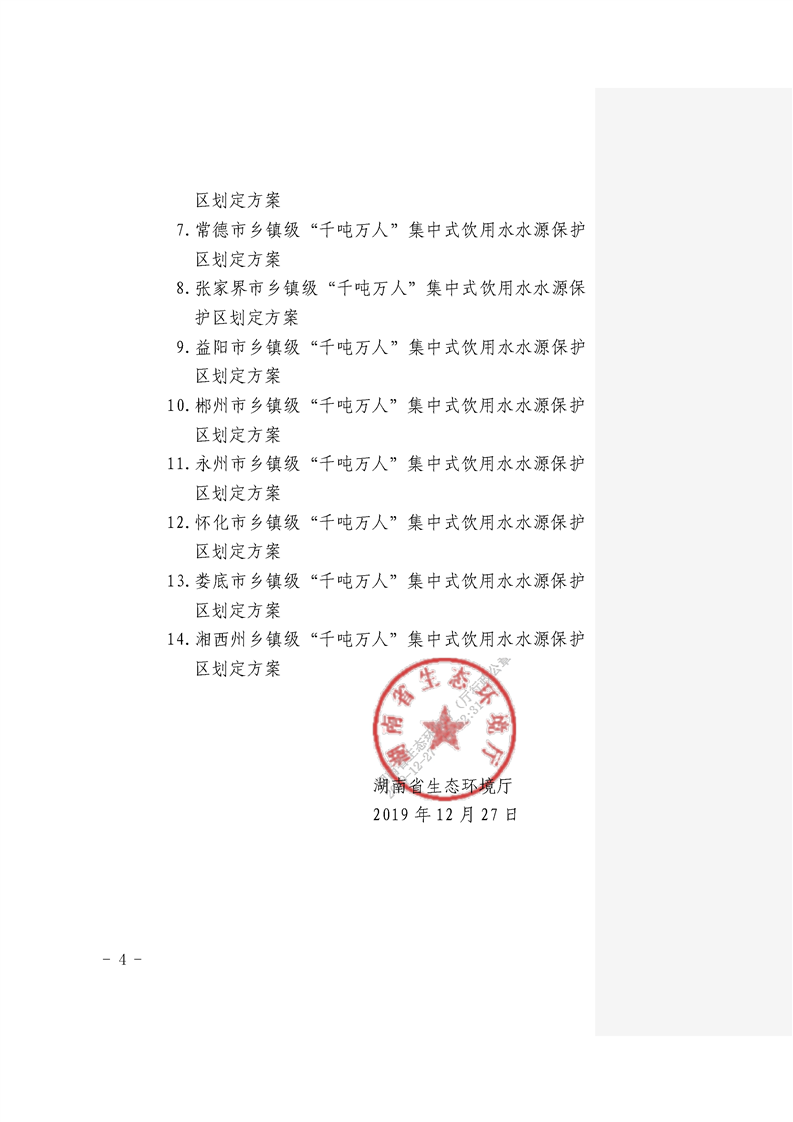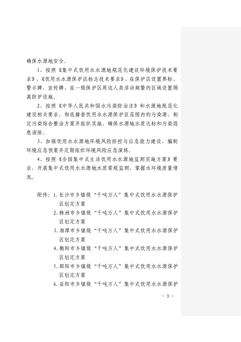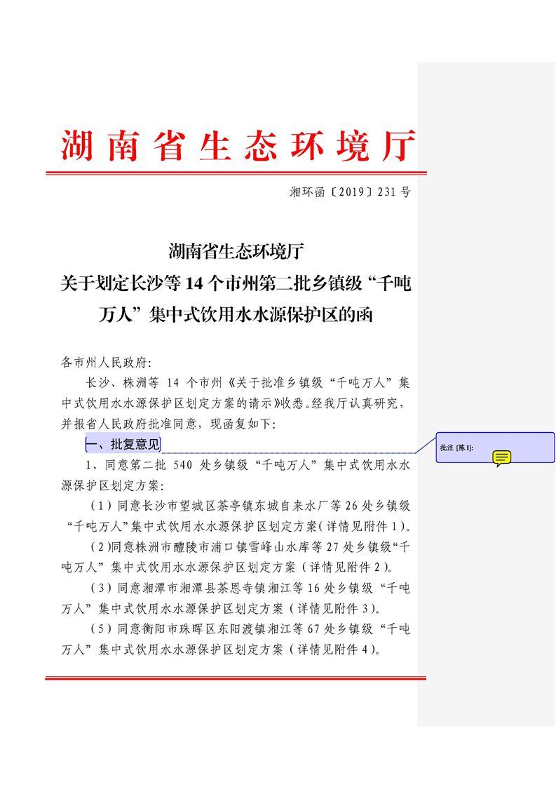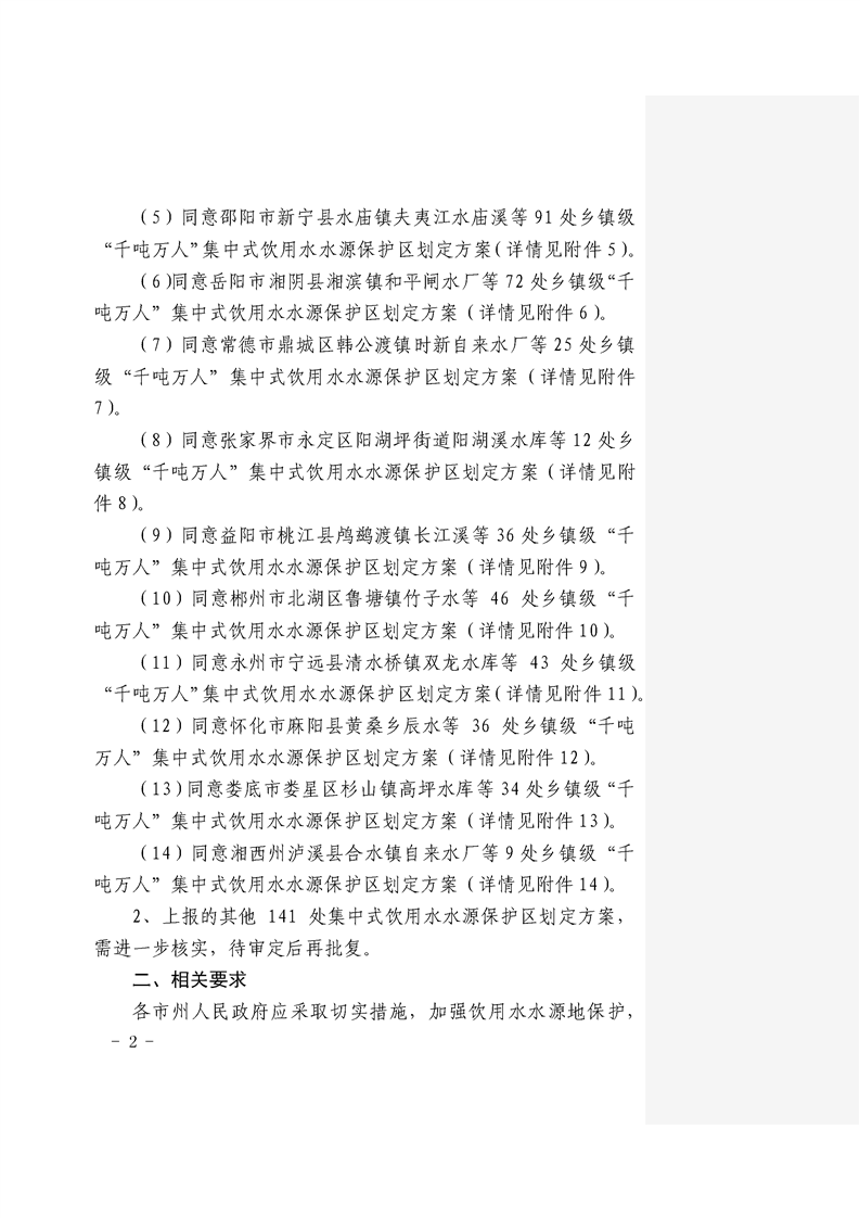 关于划定长沙等14个市州第二批乡镇级“千吨万人”集中式饮用水水源保护区的复函