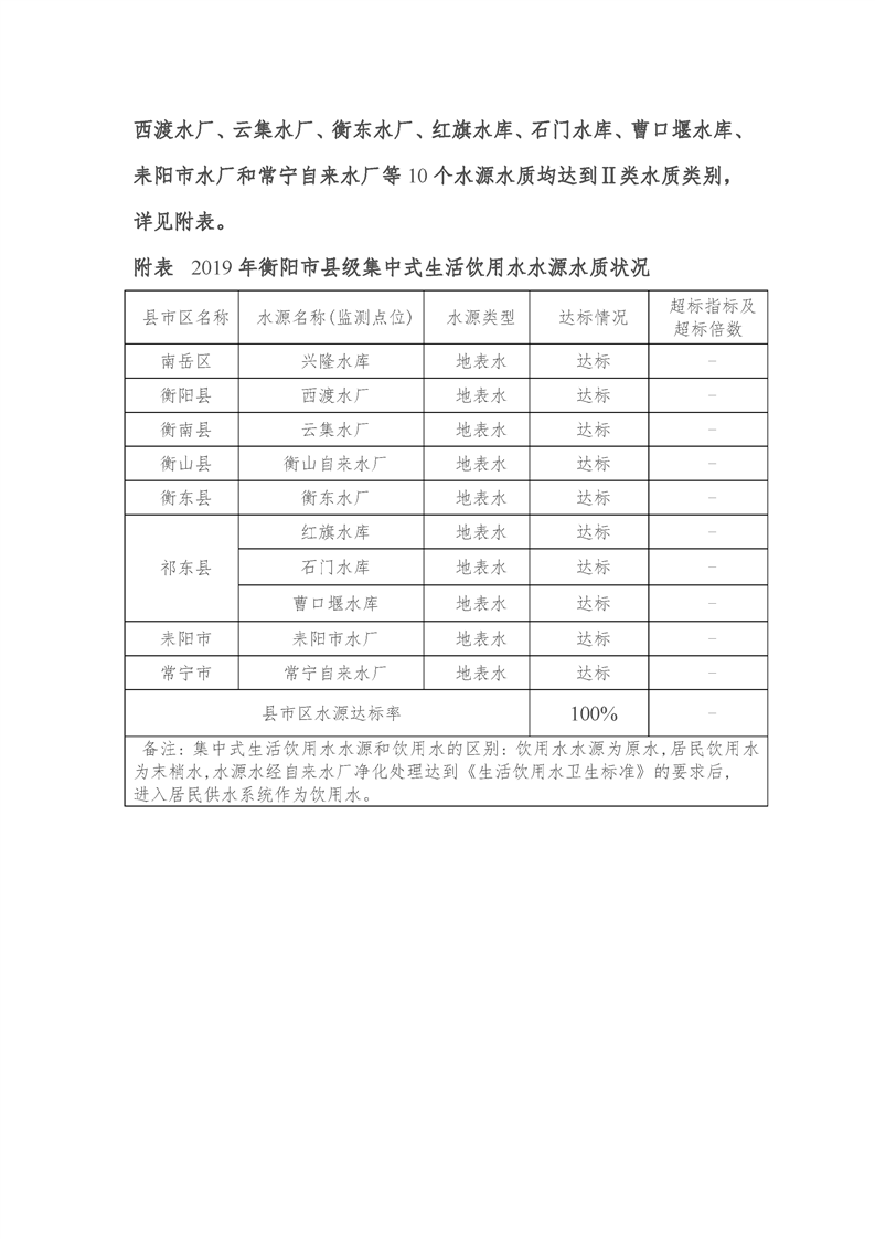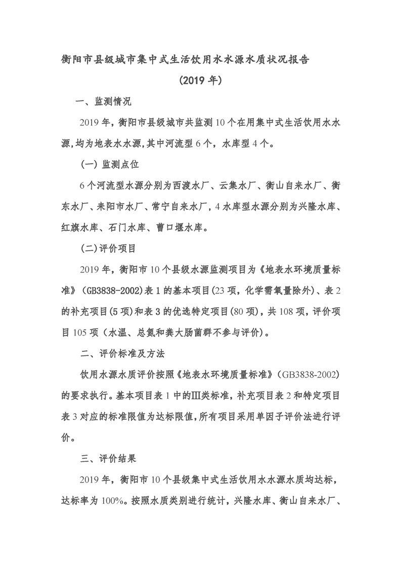 衡阳市县级城市集中式生活饮用水水源水质状况报告(2019年)