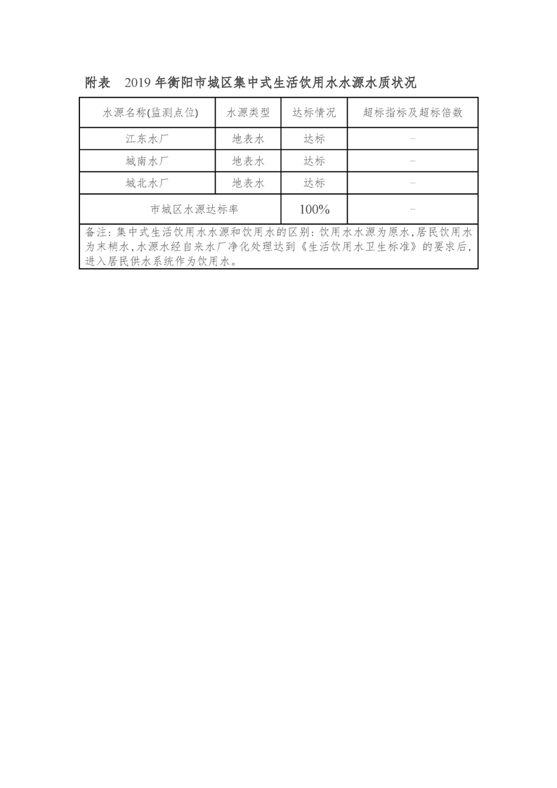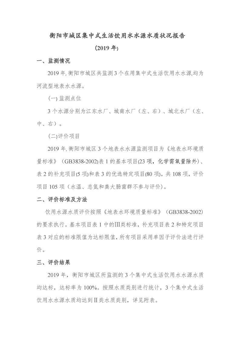 衡阳市城区集中式生活饮用水水源水质状况报告(2019年)