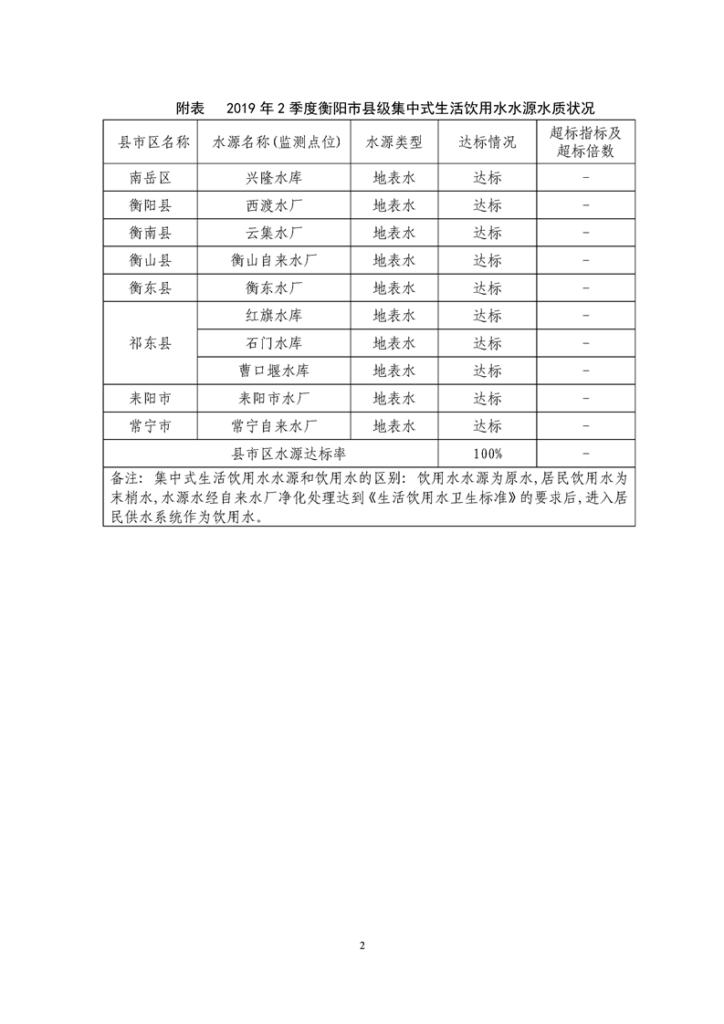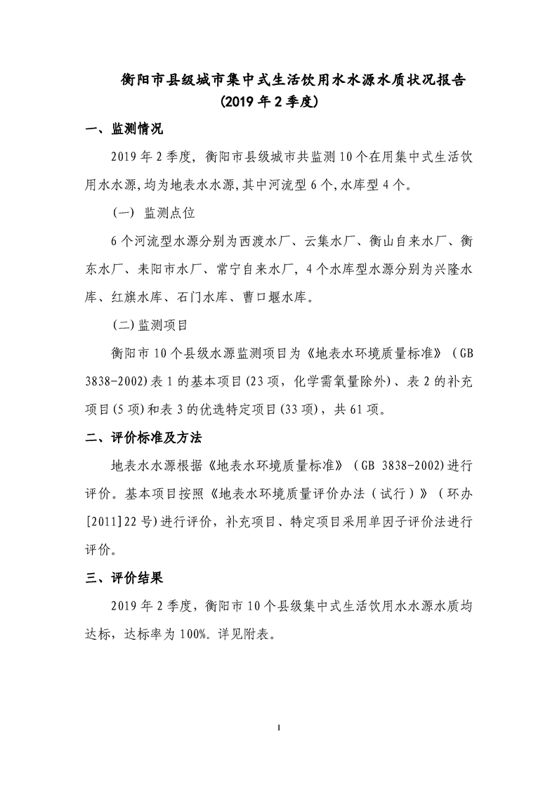 衡阳市县级城市集中式生活饮用水水源水质状况报告(2019年2季度)