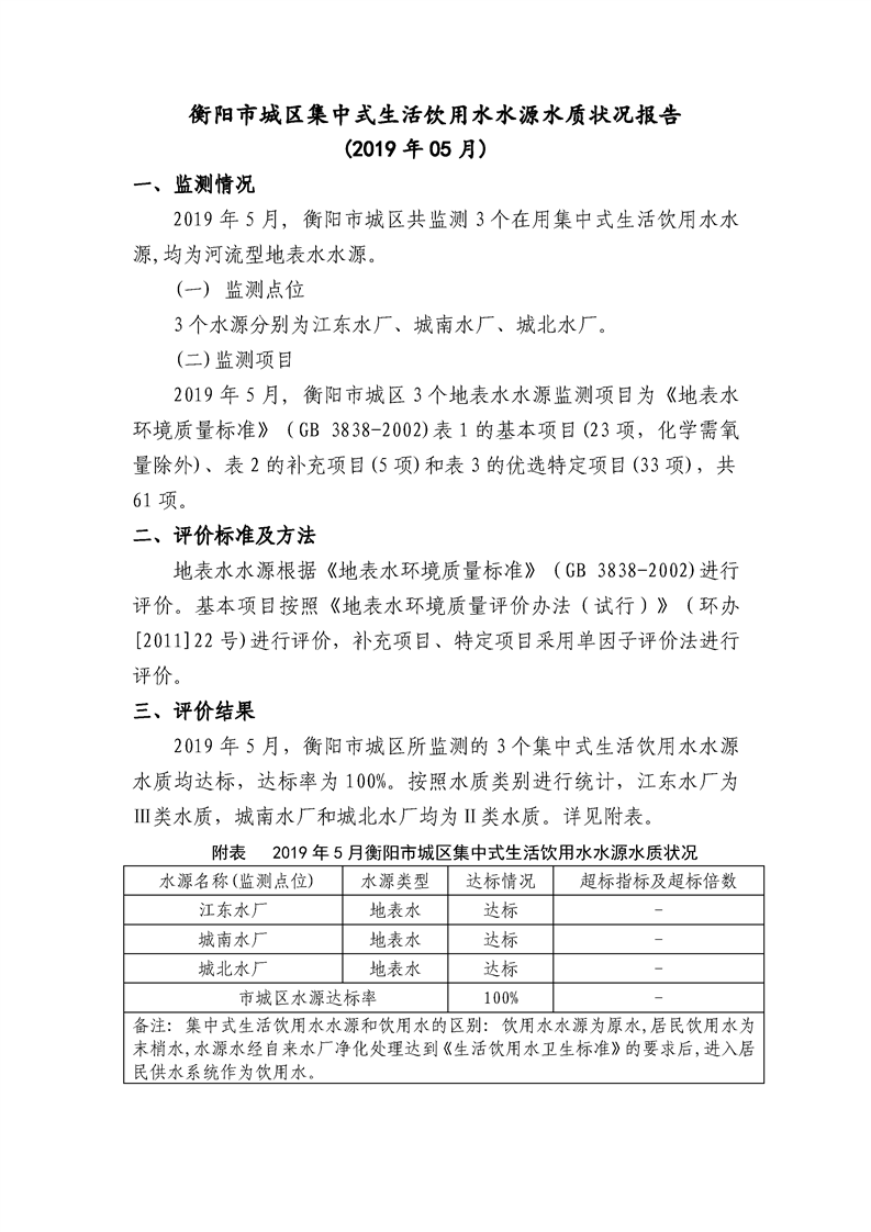 衡阳市城区集中式生活饮用水水源水质状况报告 (2019年05月)